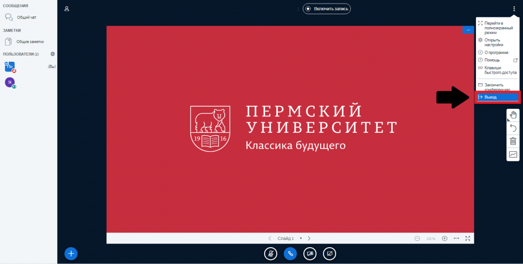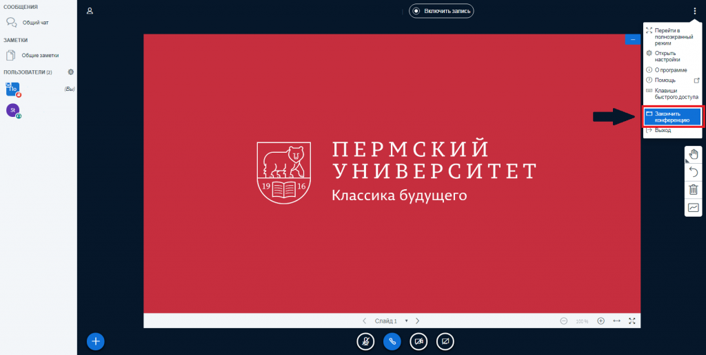 Для завершения занятие у всех – выберите в меню дополнительных опций «Завершить конференцию» (рис.2). Тогда из занятия выкинет не только вас, но и всех студентов, сервер вздохнет свободно, и все сессии на нём штатно завершатся.